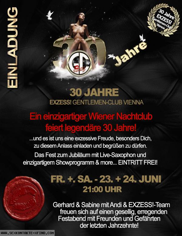 | 30 Jahre EXZESS! Gentlemen-Club – Die Jubiläumsfeier!!! Big Party ** 23. und 24.06.2023 - Live on Saxophone: Peter Sax - Champagner-Empfang - Einzigartiges Showprogramm - Ausgewählt attraktive Clubgirls - Sound nach Maß & Stimmung Welcome: 21 Uhr, Eintritt & Buffet frei Höhepunkte der besonderen Art garantiert, gefeiert wird bis open End! Freue Dich auf einen atemberaubenden Abend! EXZESS! Gentlemen-Club Vienna Bar – Strip- & Nightclub Heiligenstädterstr. 6 1090 Wien |